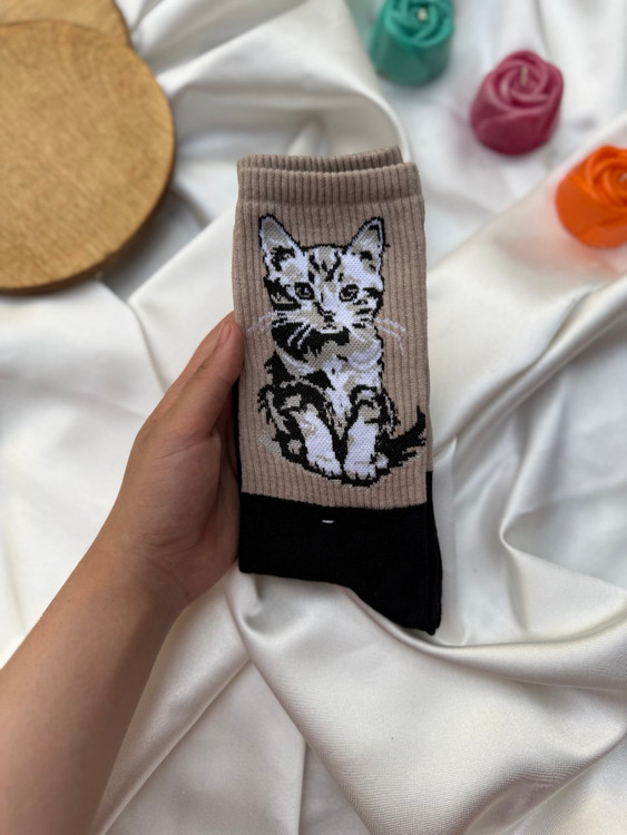 جوراب طرح دار ساق بلند خاکی گربه
